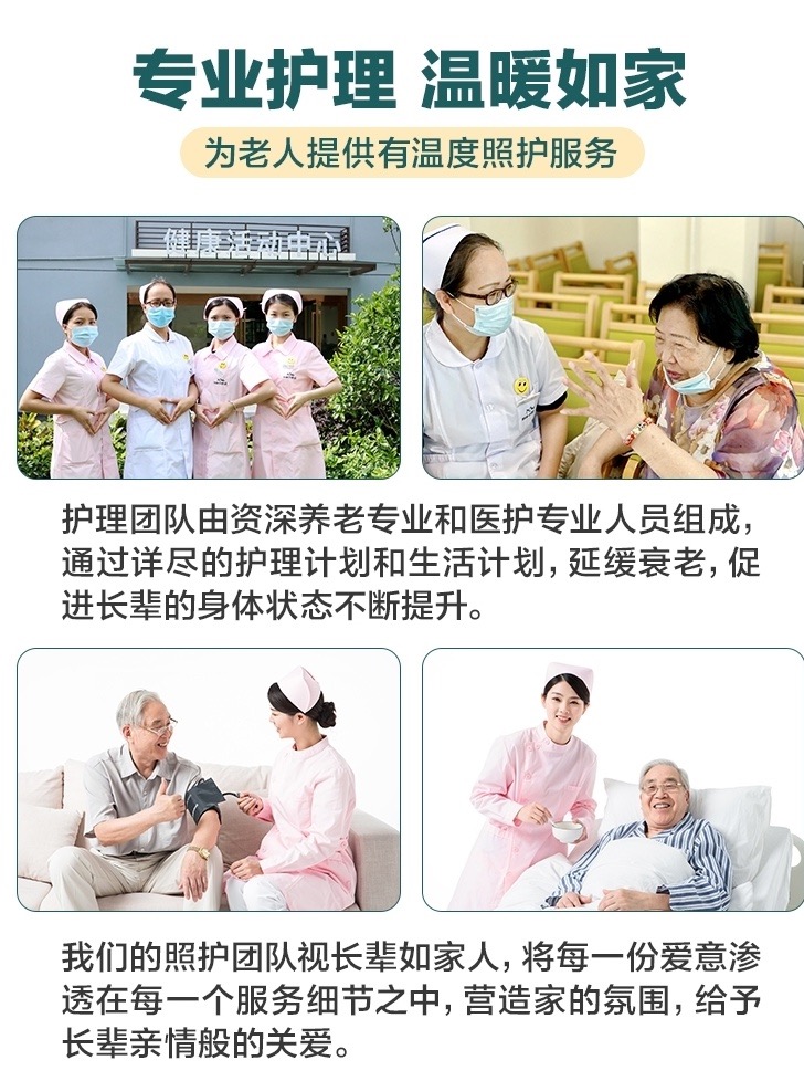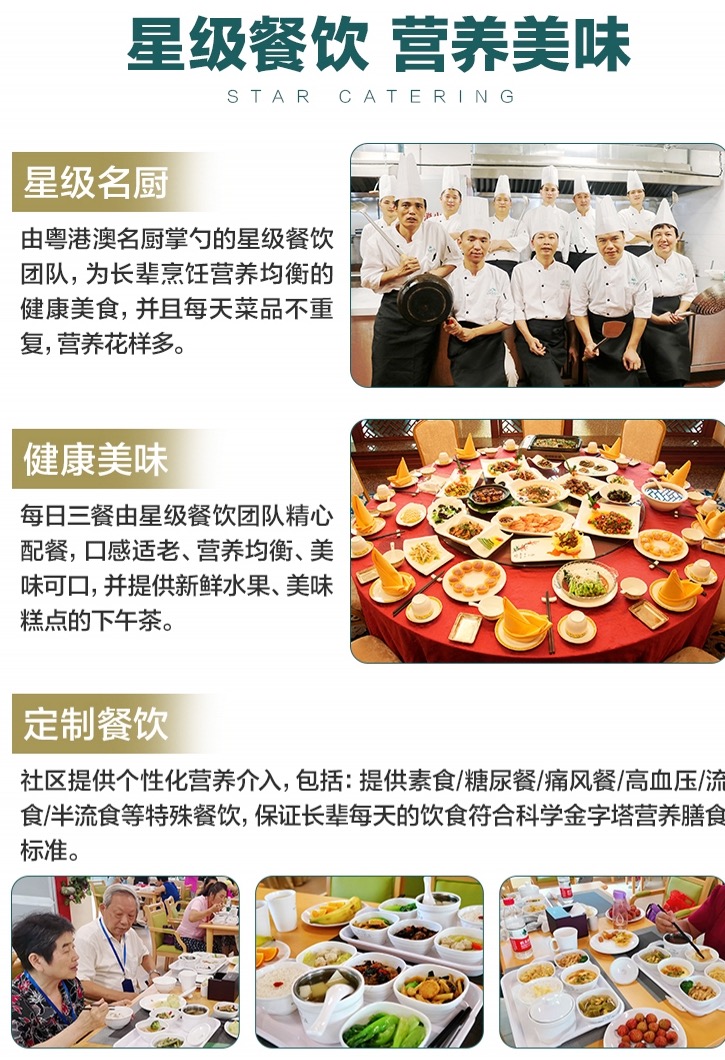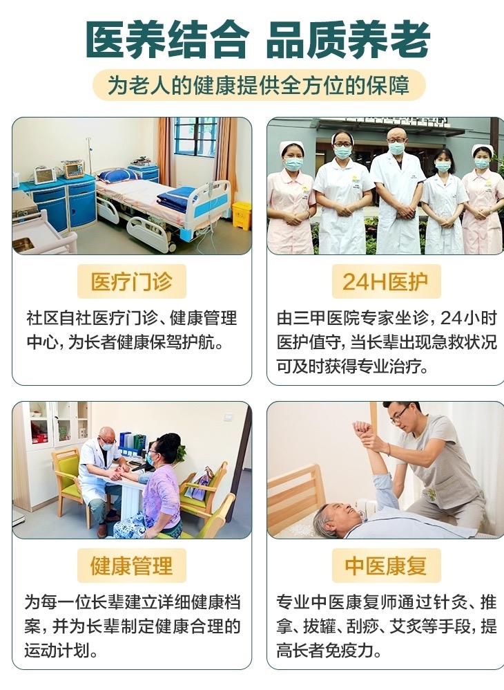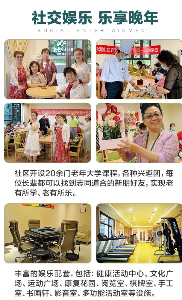 养老社区实行分区居住、分级照料。此外,在社区上万平米的配套中,涵盖了餐饮中心、健康活动中心、文化广场、运动广场、康复花园、书报阅览室、棋牌室、手工室、书画轩、影音室、公共休闲区、多功能活动室等设施,社区每天都会有各种各样的活动,不管是唱歌听戏、棋牌书画、还是健身旅游,在这里您都能找到志同道合的新朋友老伙伴。一日四餐由名厨提供,营养健康花样多;有贴心管家为您提供日常生活的全方位服务;还有专业的医护团队全方位保障您的身体健康;悉心的护理员给予长辈亲情般的照护;让长辈们快乐的享受在这里的美好的每一天!